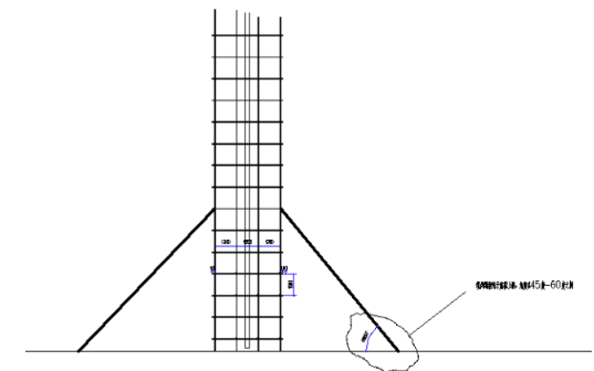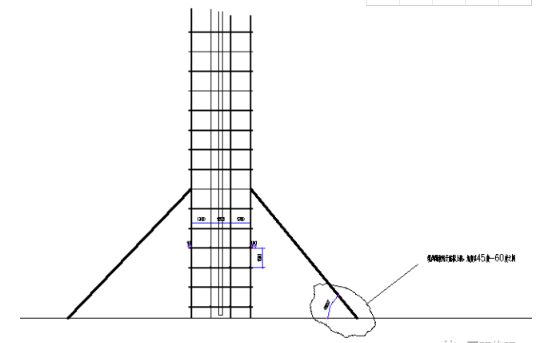 脚手架立杆采用6米和4米钢管间隔使用,使里外、左右立杆的接头错开。大横杆采用4米和6米钢管,扫地杆位置设在立杆端部200mm处,横杆步距1500,立杆横向间距1300mm、1200mm、1300mm。竖向间距1500mm,支架与基坑底部成36角,支架侧面全部搭设剪刀撑,剪刀撑的斜杆与水平面的交角宜为4560之间,连续设置。支架底部侧向45布置6m长钢管斜撑进行加固。溜槽采用DN300管子制作,管子固定用钢管卡死。搭设支架范围底板钢筋支架加密,加密支架立柱间隔与立杆横向间距相同,支架立杆底部与钢筋支架上横杆8#槽钢点焊。架体中部两侧各拉3道缆风绳,缆风绳采用大于10#钢丝绳。具体搭设方法见附图。