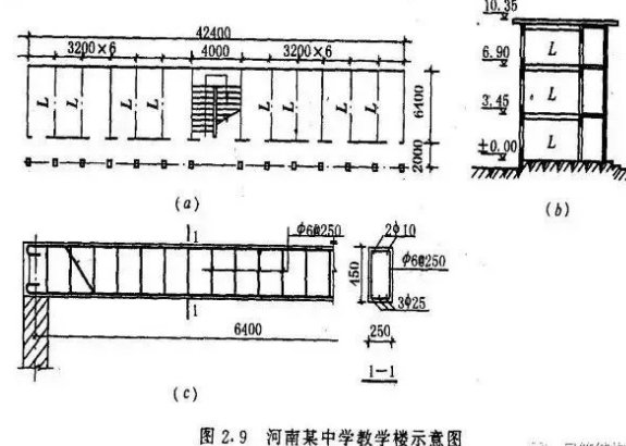 该建筑的平面 、立面、剖面、及主要尺寸如图.教学楼为二层砖混结构,基础为水泥沙浆砌筑的毛石基础,墙厚180MM.顶头大教室中间深梁为现浇钢筋混凝土梁.三个月后拆除大梁底部支撑及模板,开始装修发现墙体有较大变形,工人用锤子将凸出墙体打了回去,继续施工.第三天发现大教室的窗墙在 市内窗台下约100MM处有一条很宽的水平裂缝,宽约20MM.整个房屋就全部倒塌,两层楼板叠压在一起.未及时撤离的工人全部死亡。