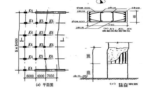某剧场挑台平面和柱截面配筋如图2.19(a)、(b)所示。在14根钢筋混凝土柱子中有13根有严重的蜂窝现象。具体情况是:柱全部侧面面积142m2,蜂窝面积有7.41 m2,占5.2%;其中最严重的是K4,仅蜂窝中露筋面积就有0.56 m2。露筋位置在地面以上1m处,正是钢筋的搭接部位(图2.19c)。