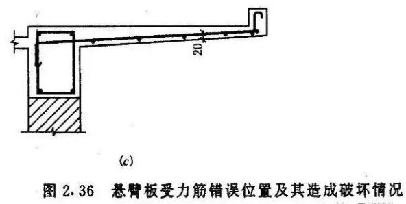 受力筋放错了位置(离模板只有20mm,如图2.36c)所致。原来受力筋按设计布置,钢筋工绑扎好后就离开了。打混凝土前,一些好心人看到雨篷钢筋浮搁在过梁箍筋上,受力筋又放在雨篷顶部(传统的概念总以为受力筋就放在构件底面),就把受力筋临时改放到过梁的箍筋里面,并贴着模板。打混凝土时,现场人员没有对受力筋位置进行检查,于是发生上述事故。