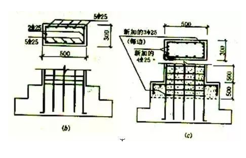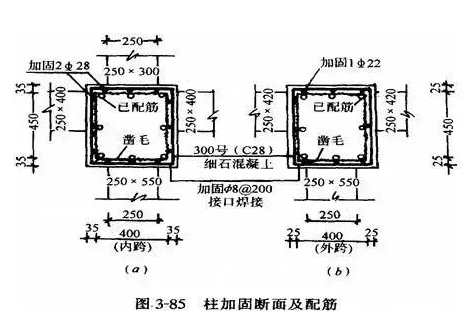 加固构件:凿去4,5层的保护层,露出柱四角的主筋和全部箍筋,用通长钢筋加固,加固直径,间距与原设计相同 。