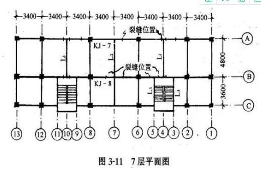 某邻街建筑的底层为商店,2层以上为宿舍,是7层现浇框架结构,纵向二跨,其第7层平面图如图3-11所示。
