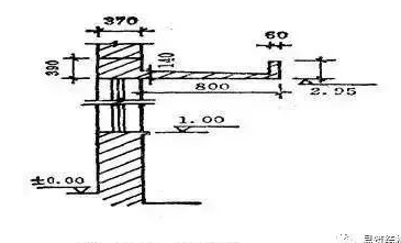 某四层内框结构,外墙一层窗上设有挑出80cm的现浇钢筋混凝土遮阳板(图4-5)。