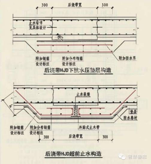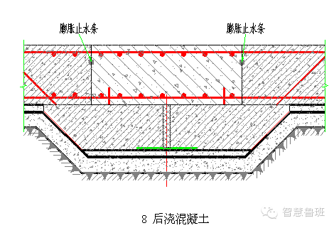 一般情况下,底板后浇带超前止水做法分两种:沉降后浇带和伸缩后浇带,具体做法见下图。