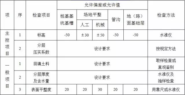 2、填方施工结束后,应检查标高、边坡坡度、压实程度等,检验标准应符合下表的规定。