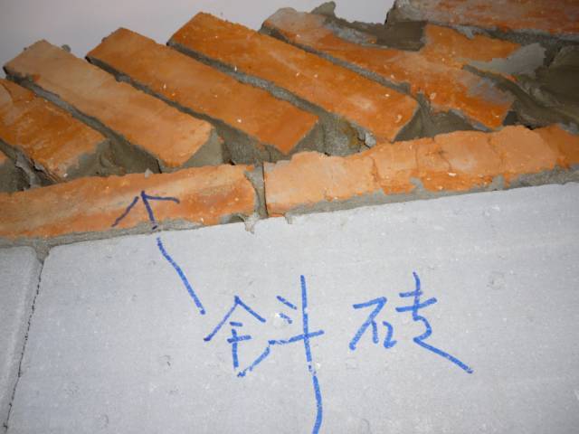 施工要点1:砌墙顶砖斜砌,防止顶部抹灰开裂,同时在抗震方面也有一定作用。