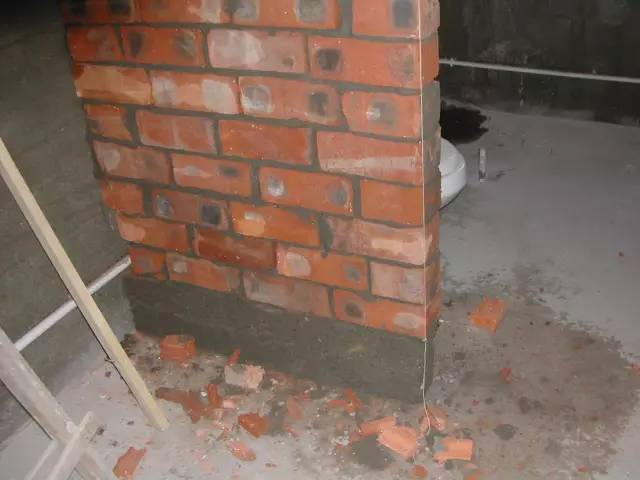 施工要点7:卫生间新砌墙体下部要做防水导墙,做混凝土砌块,一般高度在15~20cm。此外,还需要注意上跟 线,下跟棱,左右相邻要对平。