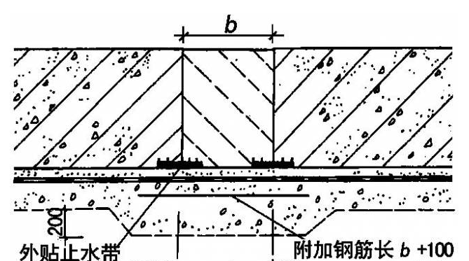 后浇带3处可将底板局部加厚,并设止水带。由于底板加厚一般不超过25cm,不宜设置中埋止水带,宜用外贴式止水带:
