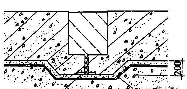给排水、供暖和电缆管道穿过地下室外墙,应做好防水处理,否则极易沿管根部发生渗水。为保证防水施工和管道的安装方便,管道位置应离开内墙角或凸出部位25cm,管与管之间间距应大于30cm。直埋式适于管径<5cm的穿墙管: