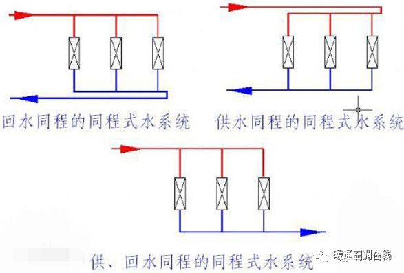 同程和异程指的是供、回水干管的水流方向,当二者方向相同时称之为同程,反之则为异程,实际工程中以异程较为多见。