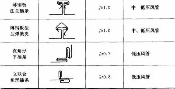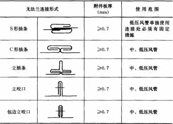 采用金属薄板制作风管连接通常有咬接、焊接、铆钉连接三种形式,采用何种方式连接,应根据风管材质及板厚按表所示标准确定。