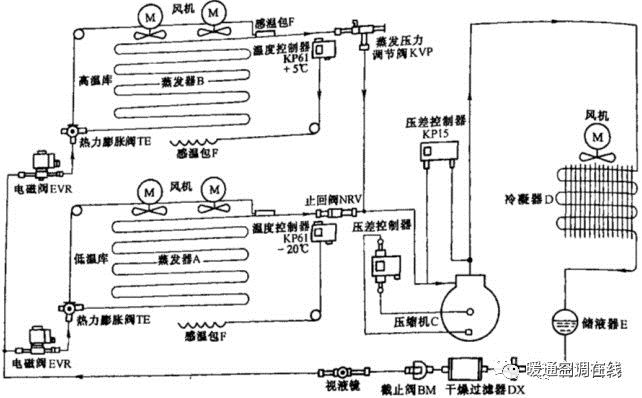 制冷剂经DX干燥过滤器流到热力膨胀阀TE,截止阀BM装在干燥过滤器DX前,可方便更换干燥过滤器。在每个热力膨胀阀TE前,装有电磁阀EVR,由温度控制器(现电子温控器用的多)KP61来控制。温度控制器根据感温包F处的温度来开关电磁阀。从低温库蒸发器来的吸气管路上装有止回阀NRV,此阀在压缩机停止运行期间,可以防止制冷剂回流到低温库蒸发器。