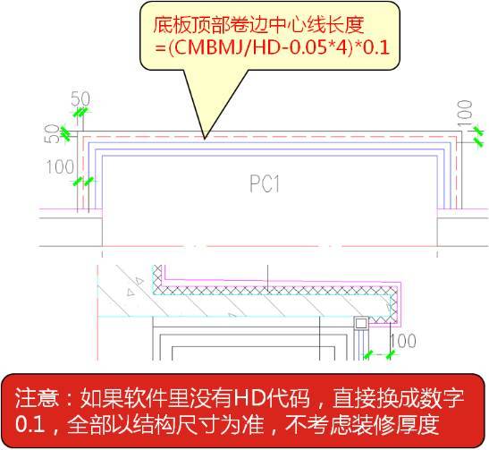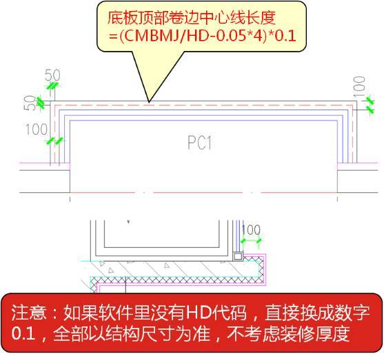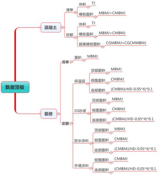 估计很多朋友看不懂(CMBMJ/HD-0.05*4)*0.1,我解释下,CMBMJ是飘窗底板侧面模板面积,除以HD(厚度)就是侧面长度,减去0.05*4就是我们要求底板装修上翻的中心线长度,在乘以0.1就是上翻的面积。