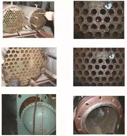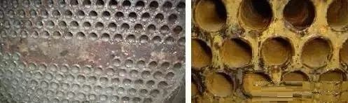 水冷冷凝器结垢,看不到紫铜管本来的颜色了,结垢已经很严重了,需及时进行清洗处理。