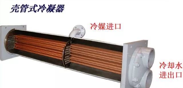 冷凝器:将制冷压缩机排出的高温高压气态制冷剂予以冷却、使之液化,以便制冷剂在系统中循环使用 。