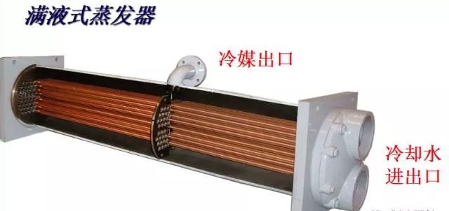 满液式蒸发器与:蒸发器在管内走水,制冷剂在管簇外面蒸发,所以传热面基本上都与液体制冷剂接触。一般壳体内充注的制冷剂量约为筒体有效容积的55%~65%,制冷剂液体吸热气化后经筒体顶部的液体分离器,回入压缩机。