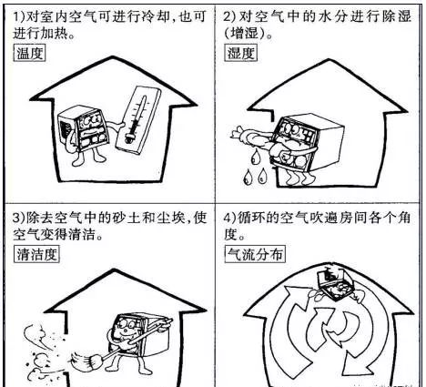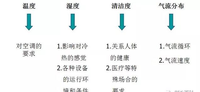 空调四要素:温度,湿度,清洁度与气流分布是所谓空调的四大要素,对四个要素加以调节,能够控制室内环境以达到舒适的要求。