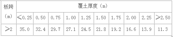 考虑板跨和不同覆土层厚度确定消防车轮压作用下的等效均布荷载数值时,可采用简化计算方法,参考表-3,表-4确定不同板跨、不同覆土层厚度时的等效均布荷载数值。