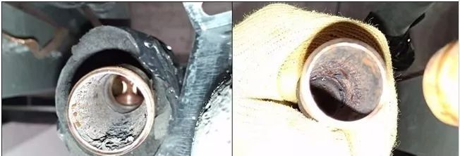 如下左图,焊接过程中没有规范操作,导致铜管内壁生成黑黑的氧化皮,而下右图安正规操作,焊接处铜管内存光亮如新,最主要是管内并无氧化皮的产生。