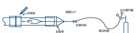 需要特别注意的是:焊接完毕后,需要再继续通氮气3到5分钟,直到不再发生氧化为止,严禁用冷水冷却铜管表面。另外,特别强调下,充氮保护气体必须是氮气,禁止使用氧气以免发生爆炸危险!焊接时氮气压力控制在0.2-0.3kgf/cm左右,不宜过大。