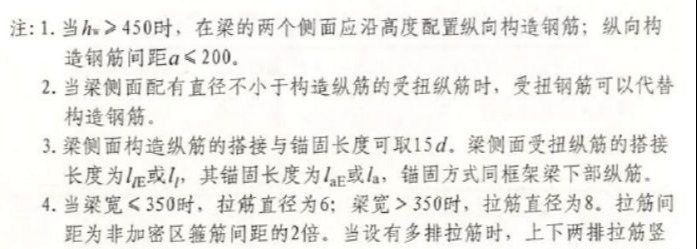 当梁腹板高度Hw450mm时,须配置纵向构造钢筋,该项注以大写字母G表示,注写设置在梁两个侧面的总配筋值,且对称配置