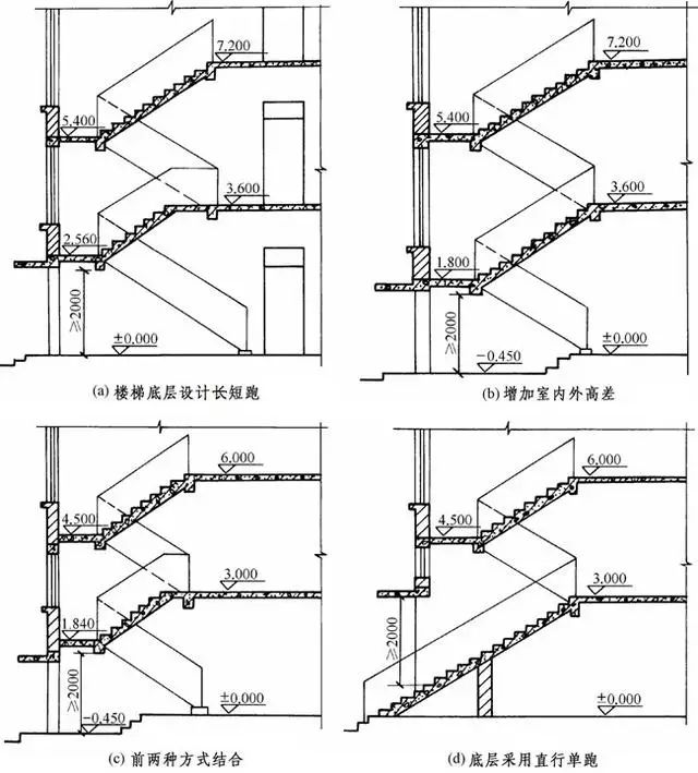 当楼梯底层中间平台下设置通道时,为满足平台下方空间净高2000mm,常采取右侧几种处理方法: