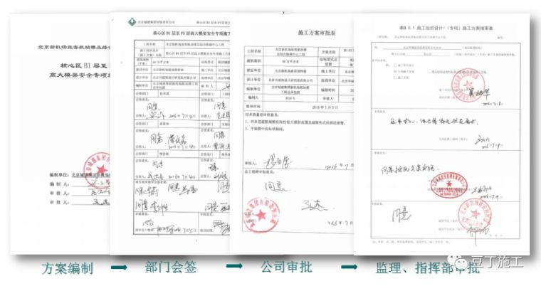 施工组织设计、专项施工方案编制后,首先进行各部门的审核会签、公司审批后向监理、指挥部报审,审批后方可组织现场施工。