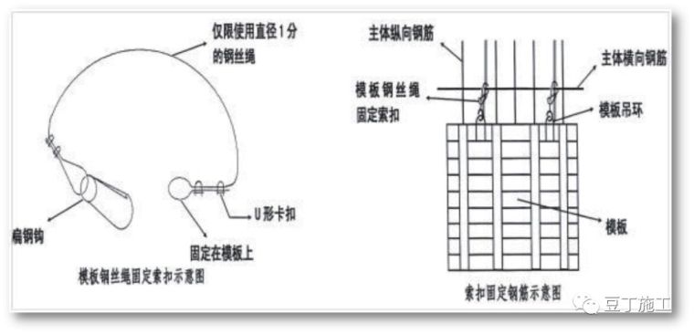 2.3.6 大模板吊装入位后和拆卸之前,必须使用钢丝绳索扣(保险钩)固定,严禁使用铁丝或火烧丝固定大模板。