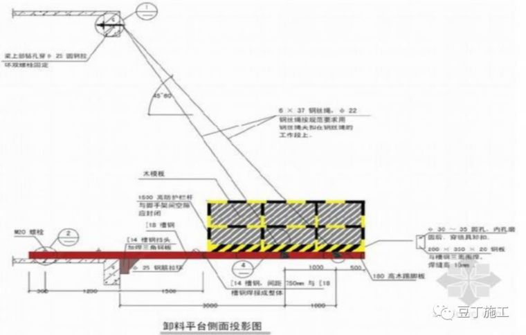 墙体(结构)上的吊点螺栓预留孔位置的选择应使钢丝绳与平台两侧垂直面的夹角不大于5。悬挑式钢平台两侧的下吊点应设置在护栏外边,并确保建筑结构、脚手架及支撑体系无干涉。每个吊点的受力钢丝绳均须独立设置,不得采用钢丝绳从平台下兜底的方式。主梁必须采用整根型钢,后端必须固定,主绳、保险绳与水平夹角应控制在4560,必须同时张紧、受力,确保受力平衡。