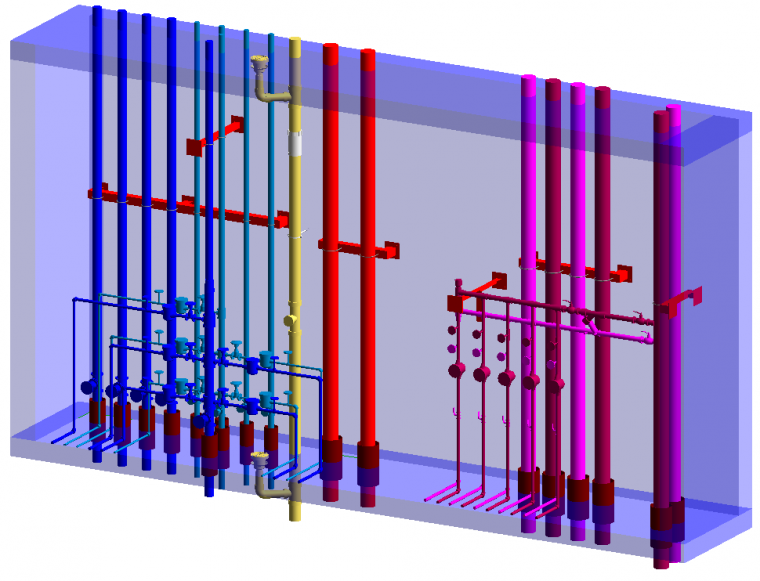 本项目应用BIM技术,对地库进行机电管线建模,碰撞检查,在主体结构施工前确定管线排布方案,指导现场预留预埋,禁止二次开洞意义更大,地上部分对主楼管井进行三维排布,为创优提供保障。