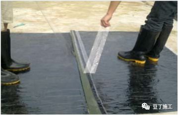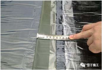 (5)卷材搭接时,搭接部位的隔离膜应全部撕掉,防止由于隔离膜没撕或忘撕而造成搭接缝粘贴不牢固、密封不严密,留下防水隐患;