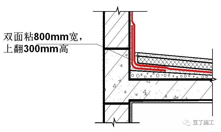 5)、卷材沿立面墙,上翻300高,此位置用宽度为800MM的双面粘折成直角铺贴,水平面的反应粘压住双面粘。