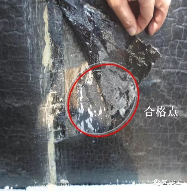 检验方法:a、观察检查。b、满粘部分用刀在卷材表面划一刀,撕不开卷材层的,即防水卷材被撕烂而不是从粘接处分离的即为合格。每 100㎡划1处检查。