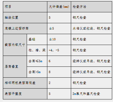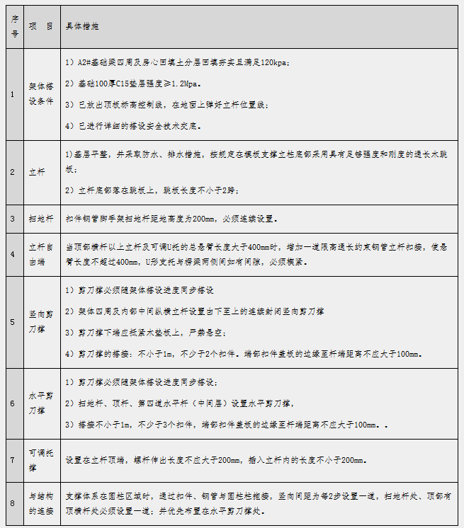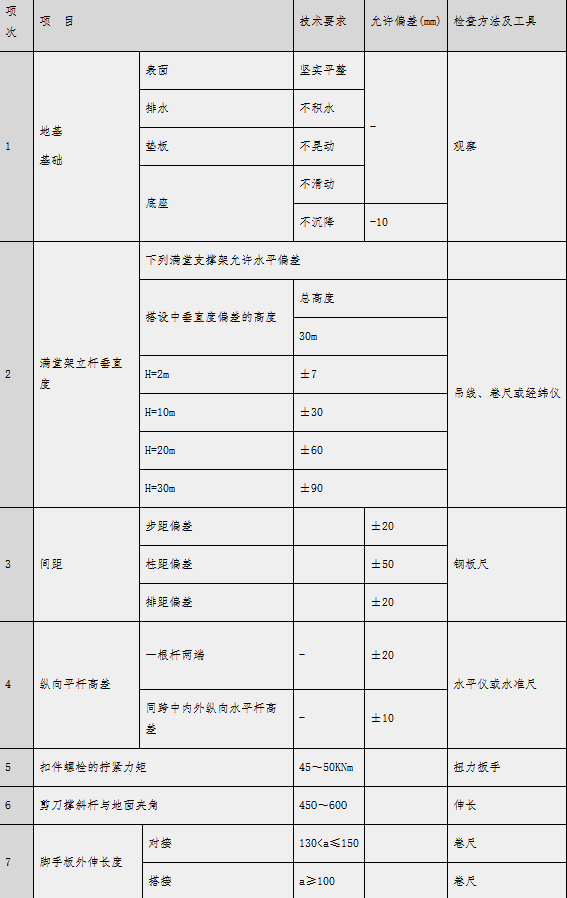 5.1 验收标准5.1.1 架体验收标准模板支撑体系搭设的技术要求、允许偏差与检验方法,应符合《建筑施工扣件式钢管脚手架安全技术规范》(JGJ130)表8.2.4的规定,见下表:
