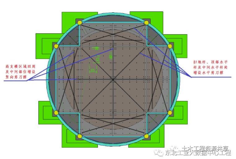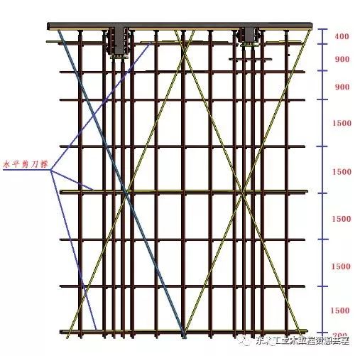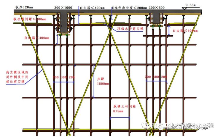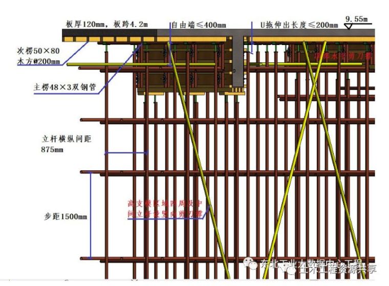 2.3.6 板模板支设板底次楞采用5080mm(计算按4575mm)木方@200mm,主楞采用483mm双钢管,利用U托传力。立杆纵横间距875mm,水平步距1500mm,在立杆四周及内部中间设置由下至上的连续封闭竖向剪刀撑,在扫地杆、顶杆、第四道水平杆(中间层)设置水平剪刀撑。
