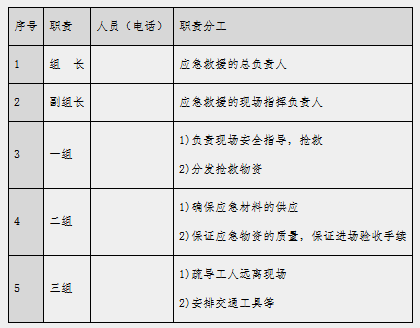 高大模板支撑体系施工区域内极可能发生高空坠落、模板坍塌、物体打击等重大事故。本预案针对上述可能发生的高空坠落、模板坍塌及物体打击紧急情况的应急准备和响应。6.1 应急小组针对高支模施工过程中可能发生的意外事故,项目部特制定应急救援小组如下:表6.1-1 应急救援小组