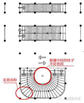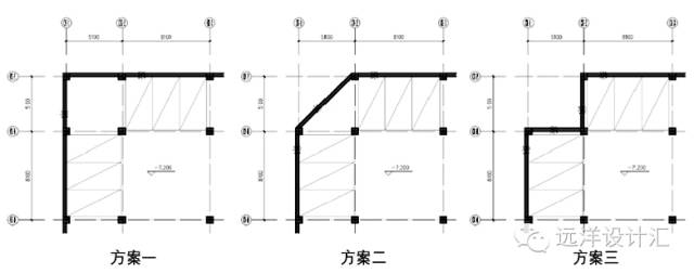 ③ 外墙车库转角处两个方向都停车时,转角部位无法停车,容易造成面积浪费。实践证明三个方案中土建造价方案一方案二方案三,因此考虑将无用的车库转角取消的做法是经济的,或者改用作其他附属用房。