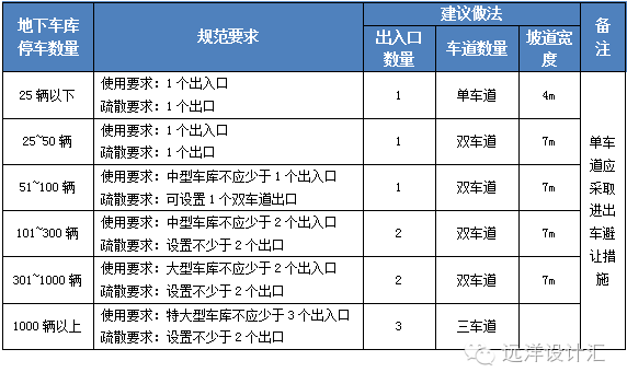 ③ 车库内坡道入口数量:对于多层地下车库,当车道上设有自动喷淋灭火系统时,可按本层地下车库所负担的车辆疏散数量来确定汽车出入口数量。