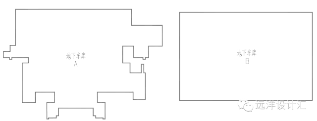 ② 尽量增加地下车库的规则性,地下车库A与地下车库B在面积相同的情况下,车库A的挡土外墙长度约为地下车库B的1.65倍。