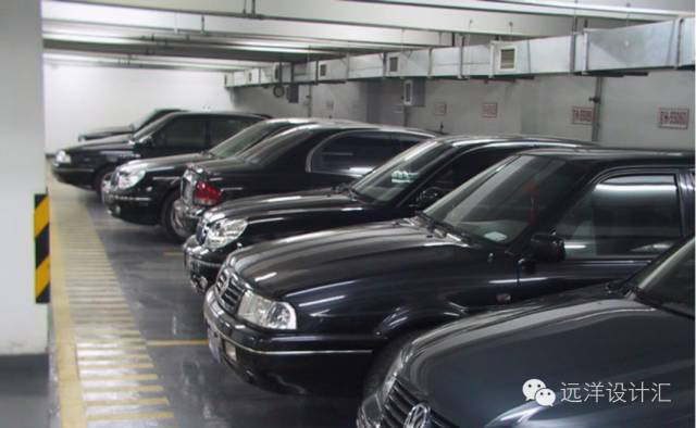 风管道尽量不要设置在车道正上方(库内车道净高不应低于2.2m,车位净高不应低于2m )、直径较大的管道可优先设置在车位尾部不走人空间(参见下图);