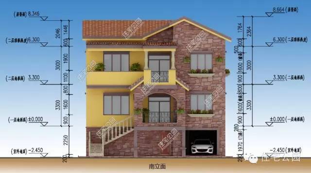 户型风格为一种特别漂亮的欧式风格托斯卡纳风格,是中国别墅广泛借鉴的一种风格,其最大特点,就是天然石材饰面和暖色涂料的搭配,搭配的方式有上下搭配和左右搭配之分,这套户型是左右搭配,增强了建筑语言的层次感以及设计感;别墅正面与众不同,侧踏步台阶的设计以及架空的门斗,让别墅艺术感品质感飙升。