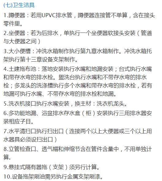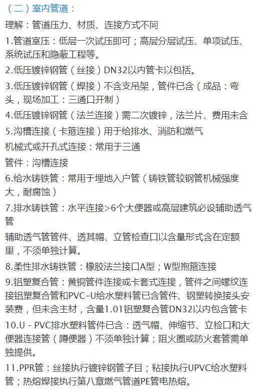 19.室内排水管材:U-PVC排水管、铸铁管、混凝土管、组成洗脸盆和饮用喷水器到共用水封之间和连接卫生器具排水短管处可用钢管。 点击免费下载海量工程资料