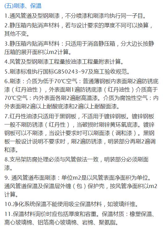 5.风管材质:普通钢板、镀锌钢板、不锈钢板、硬聚氯乙稀、有机玻璃钢、无机玻璃钢(相应的玻璃布层数不少于规范规定,其表面不得出现反卤或严重泛霜)