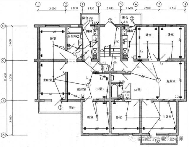 (2)住户用电。A、B两户分别在室内安装一个配电箱,其安装高度为1.8m,分别采用3路供电,其中Ll供各房间照明,L2供起居室、卧室内的家用电器用电,L3供厨房、卫生间用电。