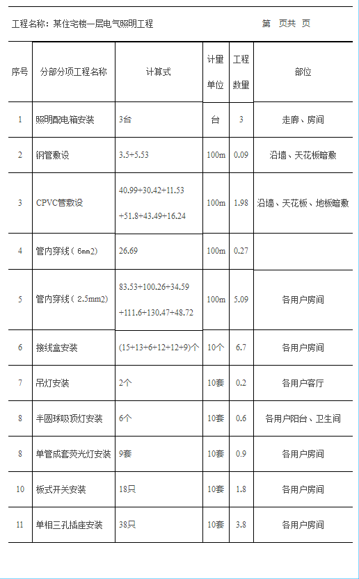 (阅读施工图和施工说明,熟悉工程内容。从电气照明平面图及电气施工说明中可知:该工程每层楼设配电箱一个(AL-1),每户设配电箱一个(AL-1-1、AL-1-2),均为嵌入式安装。楼层配电箱到户内配电箱为6mm2铜芯塑料绝缘线穿钢管沿墙暗敷。每户的配电箱均引出3条支路,各支路为2.5mm2铜芯塑料绝缘线穿UPVC管暗敷,其中照明回路沿墙和楼顶板暗敷,插座回路沿墙和楼地板暗敷。各种套管在土建施工时已经预埋设。