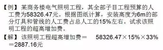 除章、节说明某些分项定额已考虑高空作业因素外,凡操作物安装高度超过楼地面5m以上、20m以下的电气安装工程,其工程超高增加费按超高部分人工费的33%计算,即