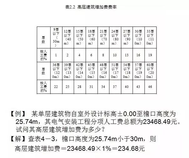电气设备安装工程高层建筑增加费按表2.2的规定计算。该费用全部为人工工资。