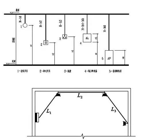 垂直方向敷设的线管(沿墙、柱引上或引下),其配管长度一般应根据楼层高度和箱、柜、盘、板、开关、插座等的安装高度进行计算,如图所示
