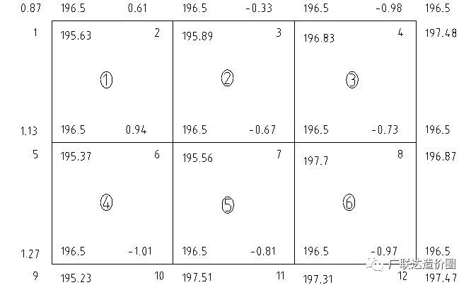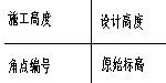 按上图的形式,填写地面原始标高(可以由测量标高的现场技术人员填写);填写设计标高;填写施工高度(施工高度=设计标高-原始标高,负值表示设计标高原始标高,需要挖方,正值表示设计标高原始标高,需要填方);填写角点编号。