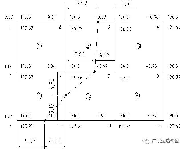 求出零点。零点存在于相邻角点的施工高度数值为一正一负的情况,表明此方格中既存在挖方,又存在填方,零点是挖与填的的分界点,即零点处既不用挖方,也不用填方。
